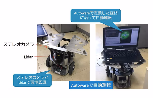 自動運転車は地図を利用しないとスムーズな動きはできませんが、地図の生成コストはとても高いという問題があります。 安価なセンサーでの地図生成機能の簡易テストとして、研究成果を自動運転用ソフトウェアAutowareに組込み、 Autowareからメガローバーを制御しました。