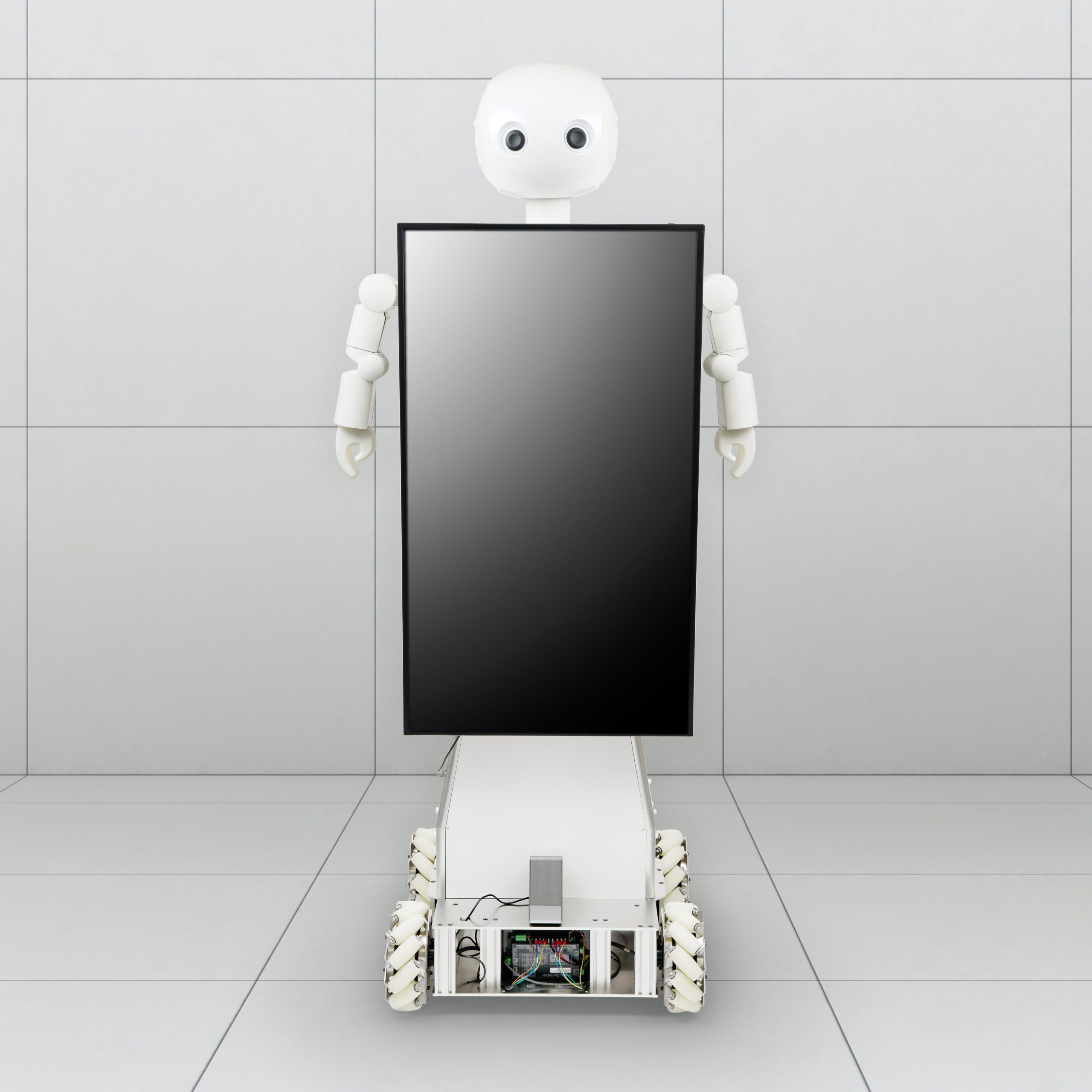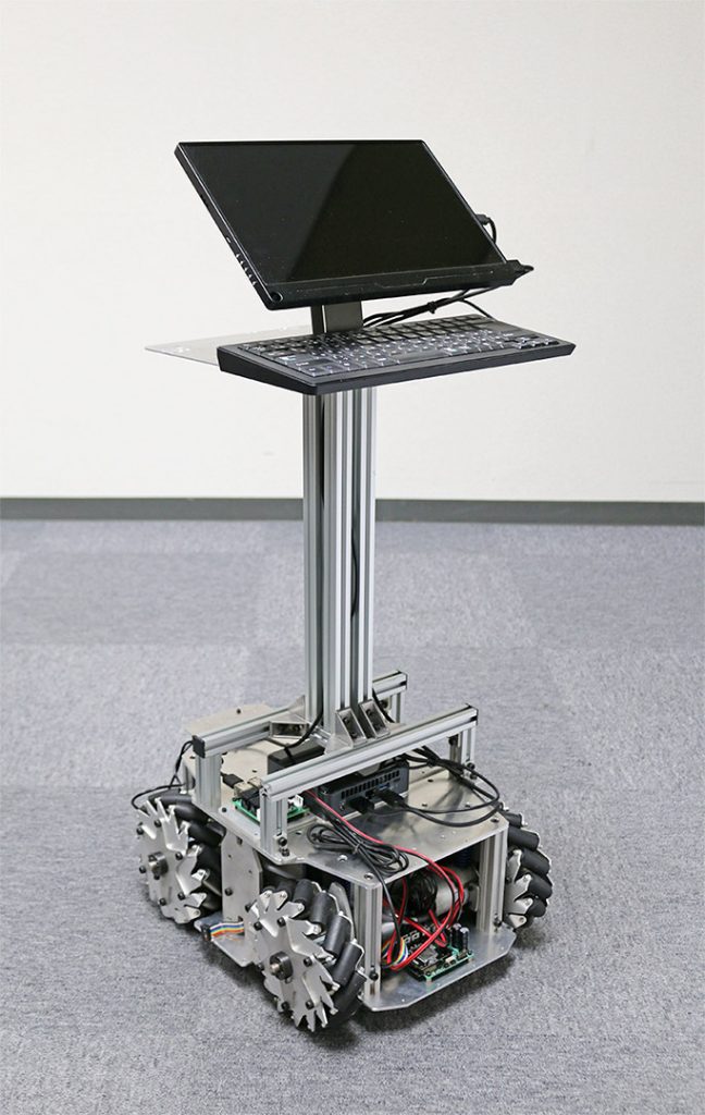 走行部には「メカナムローバーG120A」、上半身の頭部・腕部には「Robovie-R4」の部品を活用し、既存技術を組み合わせることで、ゼロから開発する場合に比べてスピーディかつ低コストでの試作を実現しました。